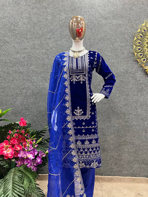 Blue Chinnon Silk With Heavy Embroidery Sequence Work Top-Bottom And Dupatta For Women