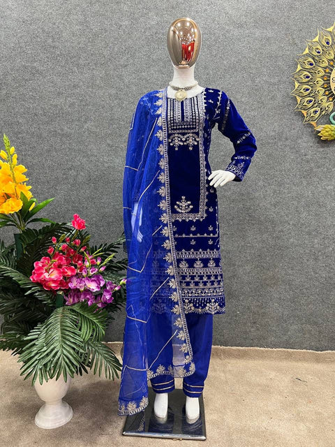 Blue Color Chinnon With Embroidery Sequence Work Top-Bottom And Dupatta