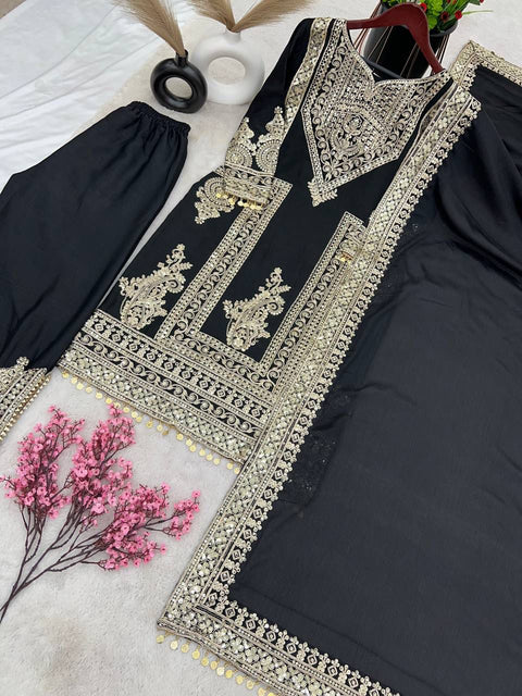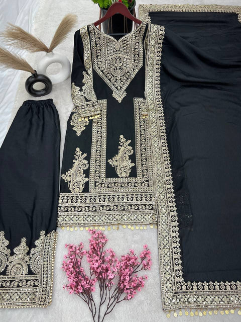 Black Heavy Embroidery Coding Dori-Sequence Work Top-Bottom And Dupatta Set For Women