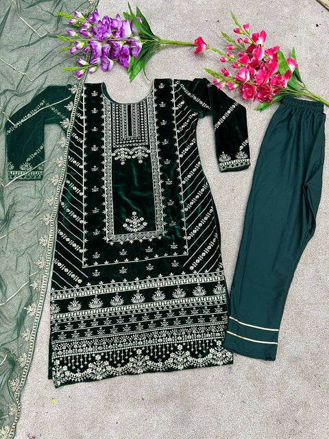 Green Chinnon Silk With Heavy Embroidery Sequence Work Top-Bottom And Dupatta For Women