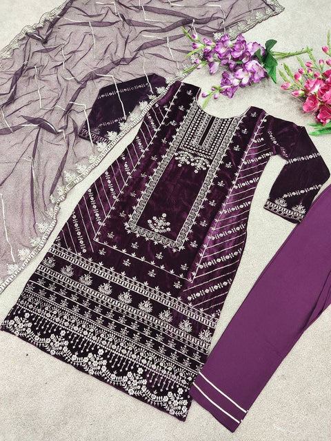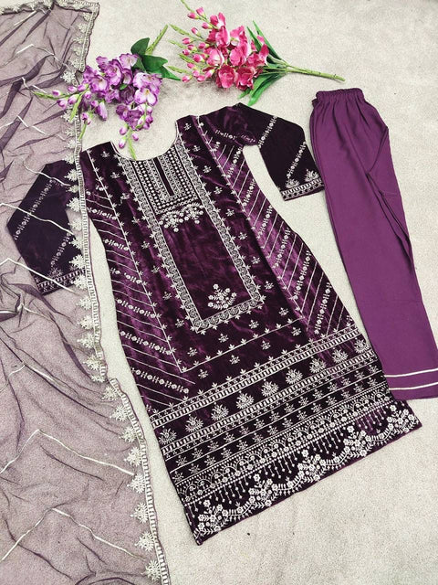 Purple Chinnon Silk With Heavy Embroidery Sequence Work Top-Bottom And Dupatta For Women