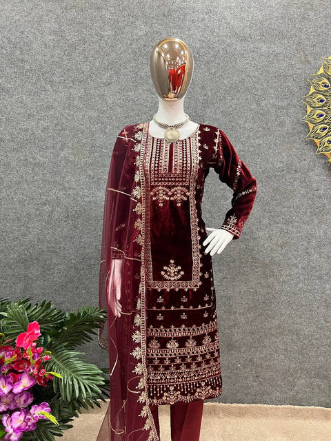 Wine Color Chinnon With Embroidery Sequence Work Top-Bottom And Dupatta