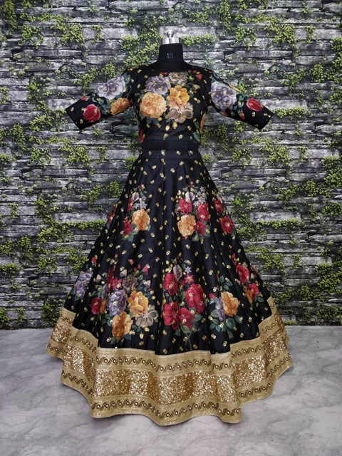 Black summer wedding wardrobe is indeed incomplete without some florals. floral printed and embellished Sequins Butti work all over
