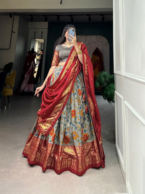 Grey Be a trendsetter in our one-of-a-kind Kalamkari Tussar Silk Lehenga, designed to make you shine with unmatched uniqueness In Wedding