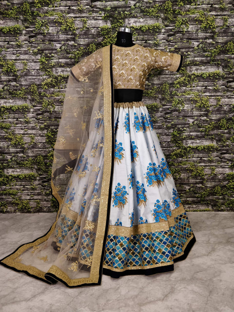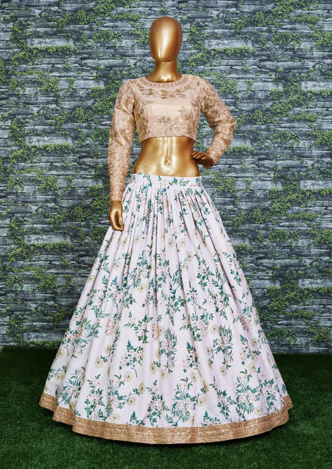 Radiant White Botanical Flower Butta printed on lehengas with Heavily Embroidered blouse.