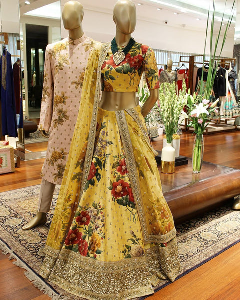 yellow summer wedding wear. floral printed and embellished Sequins Butti work all over