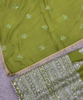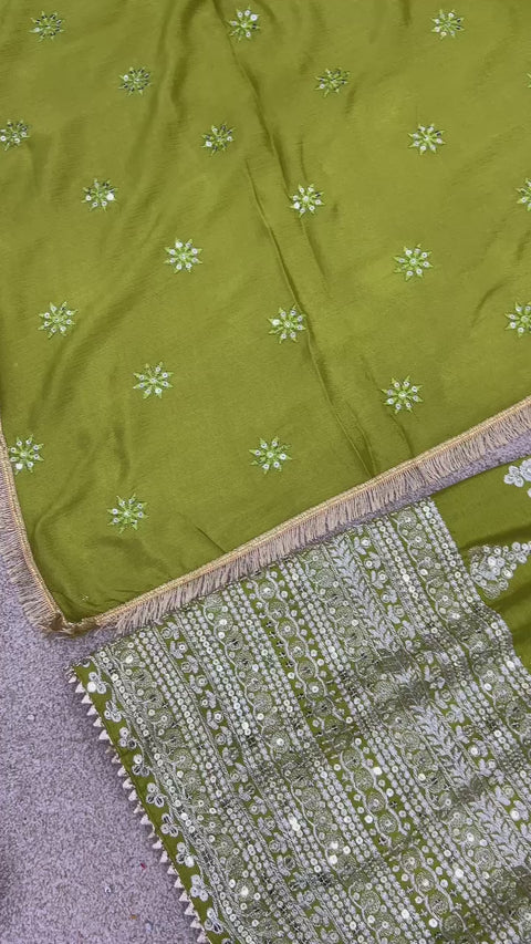 Green Chinnon Silk With Heavy Embroidery Sequence Work Top-Plazo And Dupatta Set With Fully Stitched Ready To Wear Collection For Women