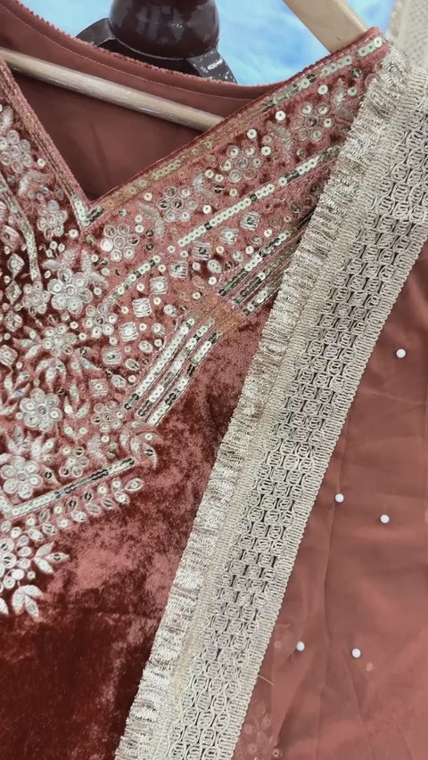Top Fabric:Heavy Pure Viscose Velvet With Embroidery 5 mm Sequence Work With Rivet Moti Work With Fancy Coin Latkan With Fancy Bell Sleeve