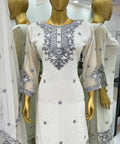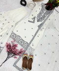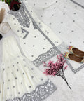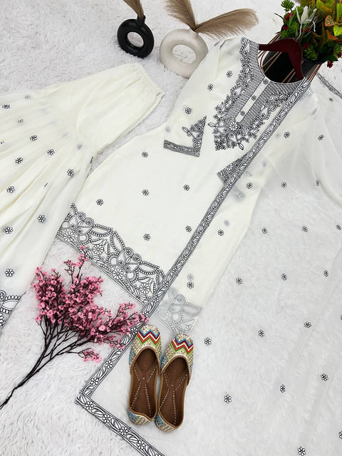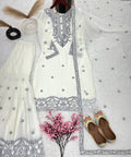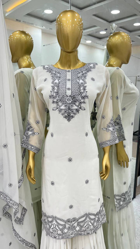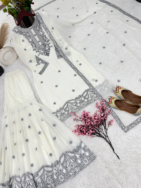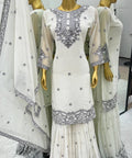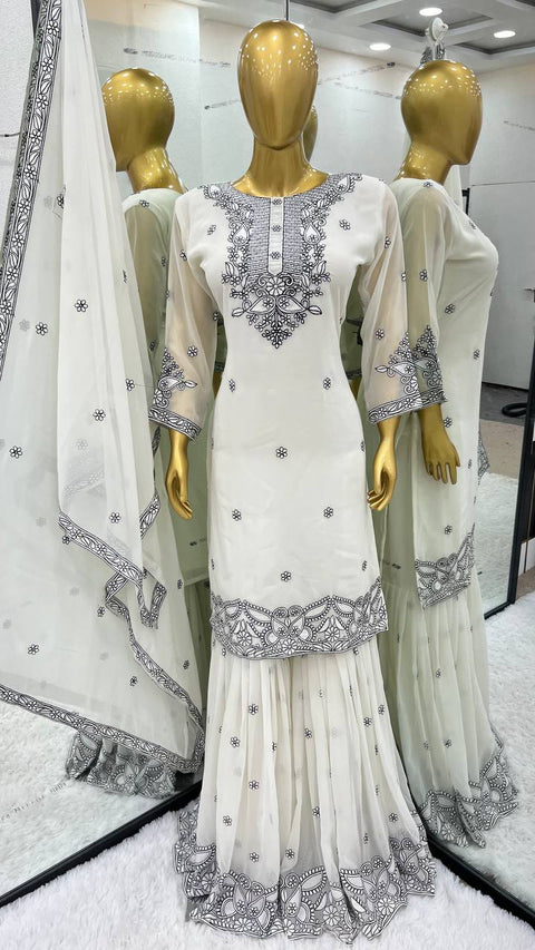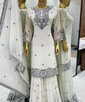White Malty Thread Embroidery Work Top-Gharara And Dupatta Set For Women